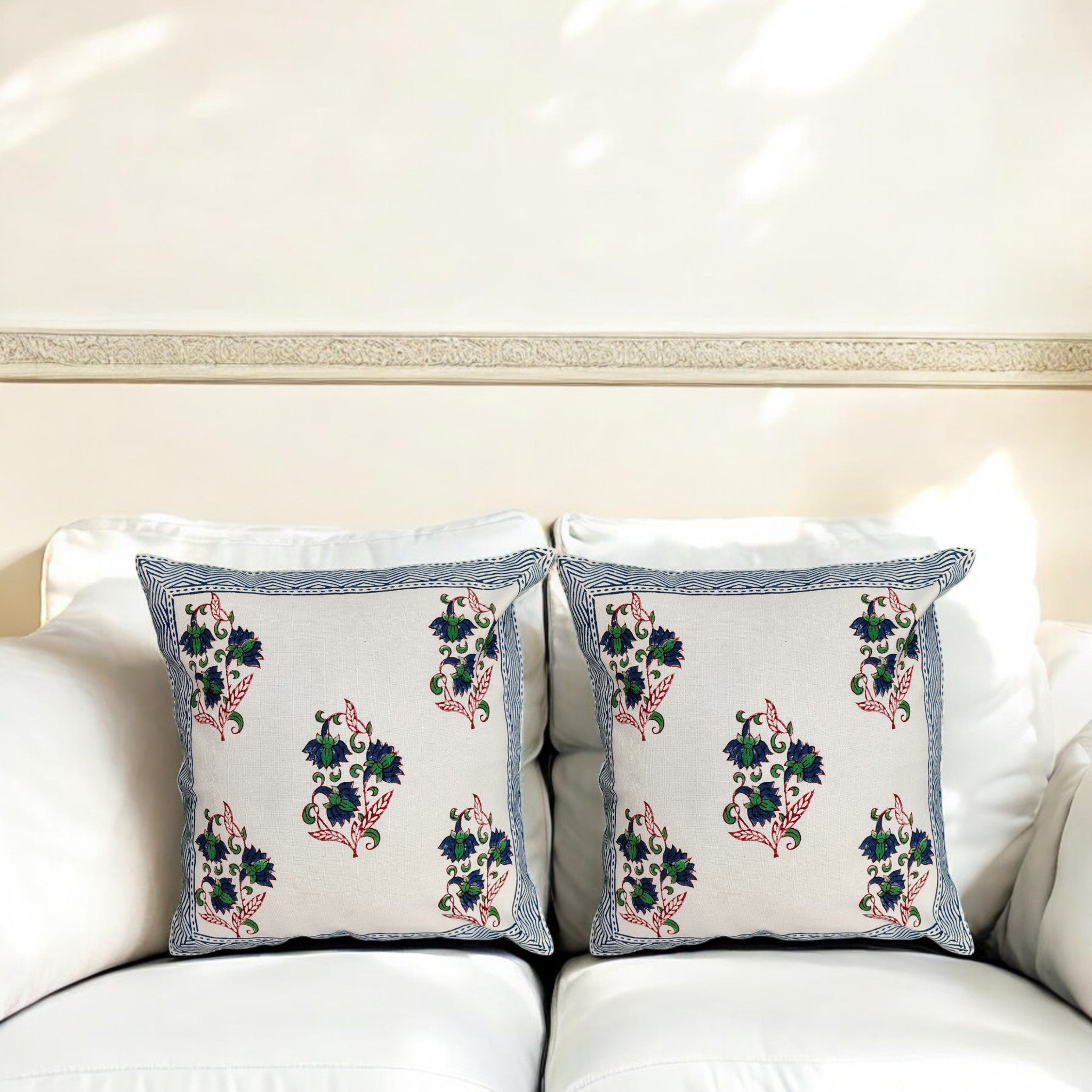 Elegant Floral Digital Print Cushion Cover, 16x16 - Blue & Green Cotton Pillow with Striped Border.